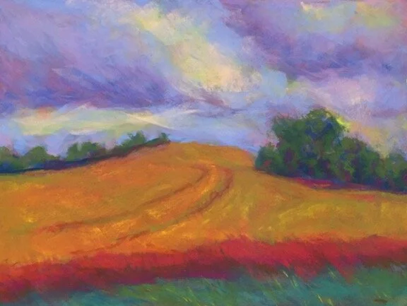 It’s a bright sunny day with a slight breeze; a view of fields and the mountains rises serenely in the distance. Susan Due Pearcy of Sugarloaf Studio sets up her portable easel, chooses her palette of pastels, and begins to put the colors she sees on her paper. The light is changing quickly, and she captures the clouds, the greens and golds of the corn in the field, and the dark teals, greens, and even purples of the Catoctin Mountains. This moment of painting in situ is plein air painting. Susan is just one of the artists on the Countryside Artisans’ Autumn Studio Tour, and her recent paintings will be for sale at the upcoming tour, October 13 to 15.