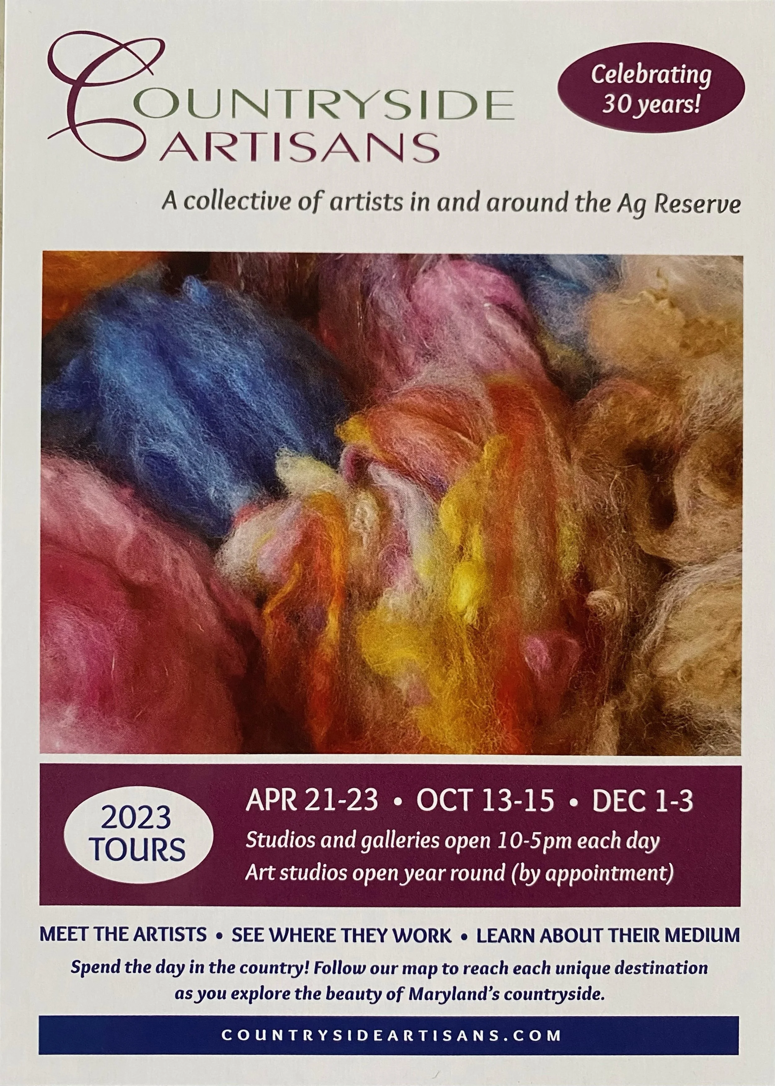 Countryside Artisans is celebrating its thirtieth year of offering pottery, paintings, prints, fiber, sculpture, blown glass, quilts, craft wine and beer, jewelry, and even tea. From humble beginnings of just a few artists, the tour has grown to fifteen studios and many more artists. In 1993, Dalis Davidson and Peg Coleman organized a few artists in the area surrounding Sugarloaf Mountain to showcase their art on their farms and studios. The Countryside Artisans studio tour was born. They host studio tours three times a year, in April, October, and December.